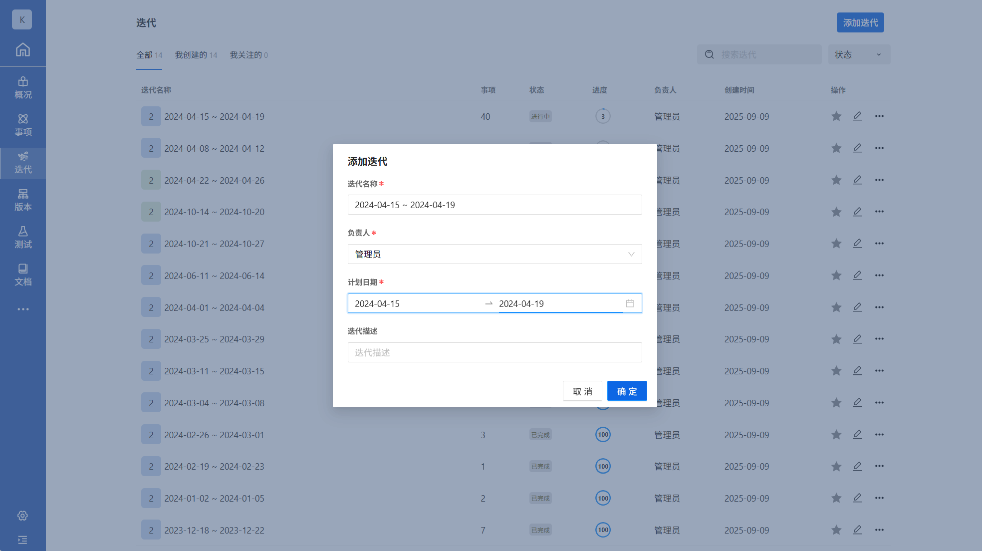 迭代概述 | 非必填 | 为迭代添加描述 |