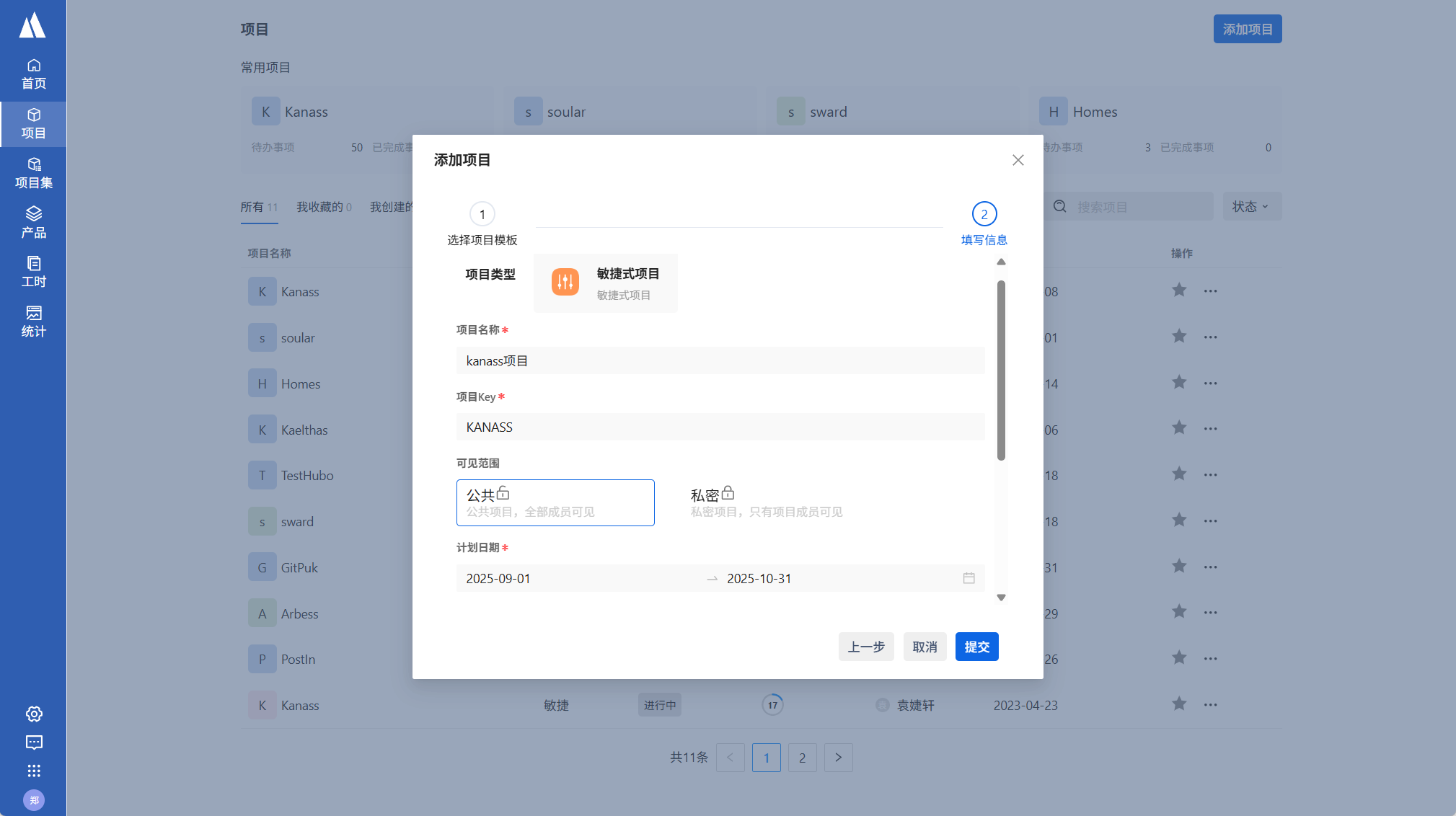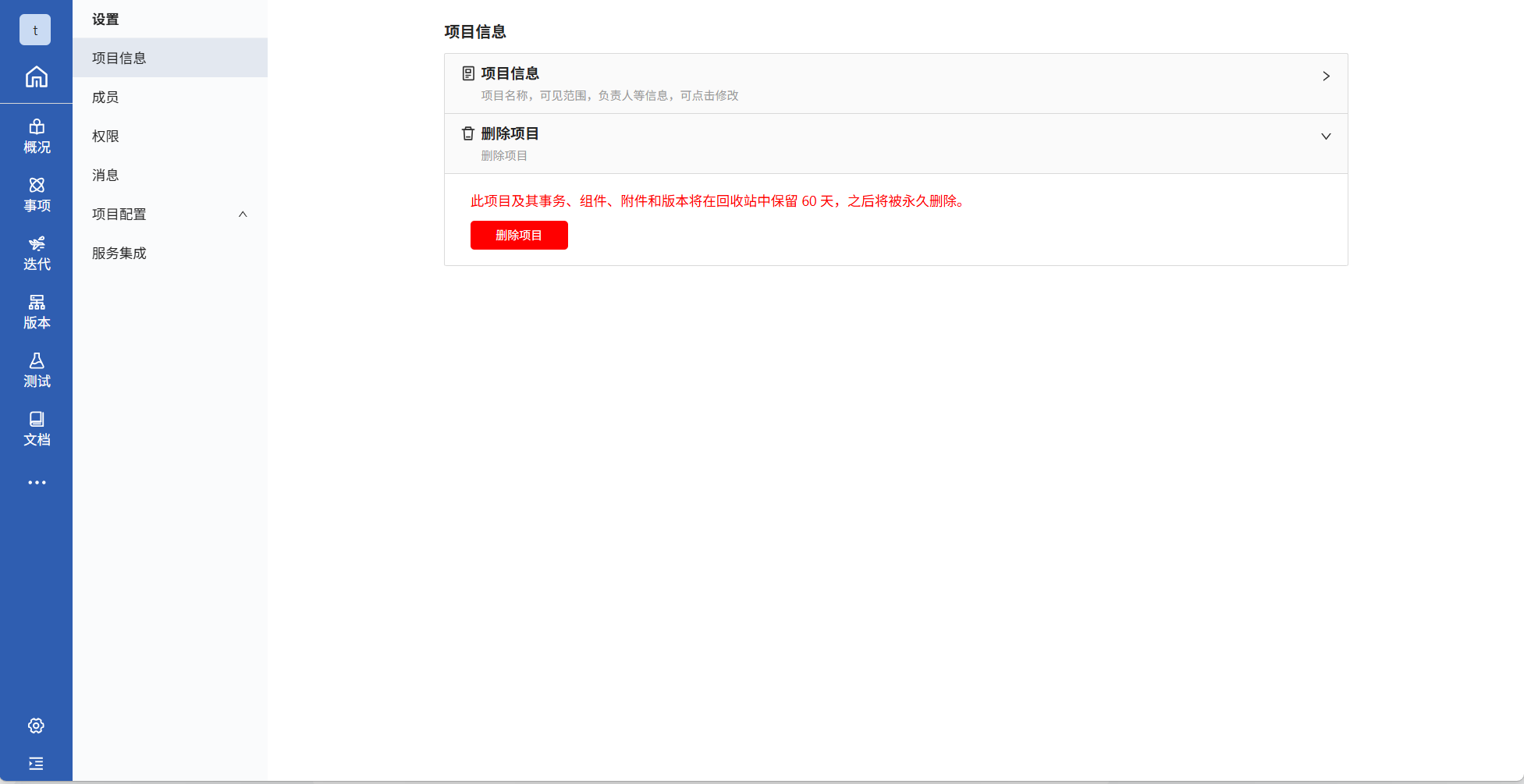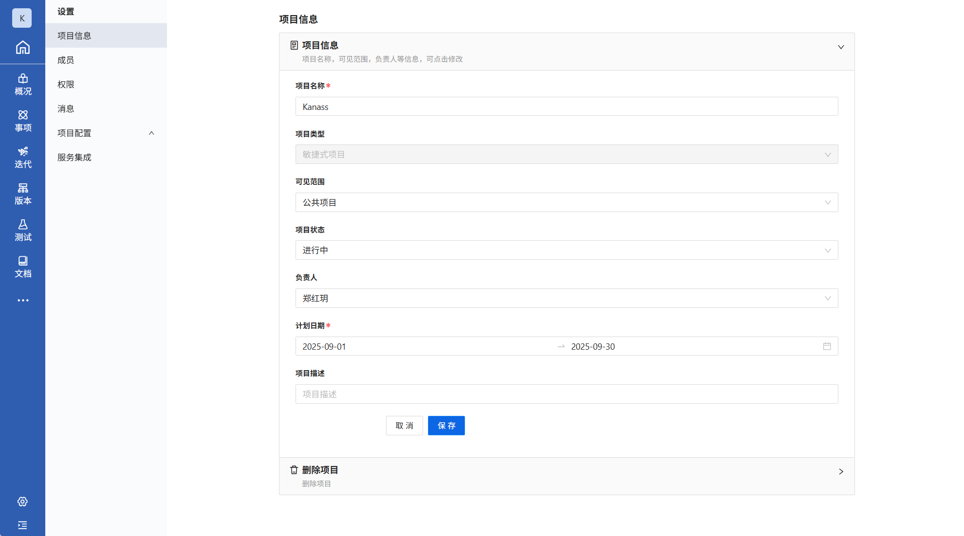 在项目详情页面可以更改名称、状态、可见范围等信息