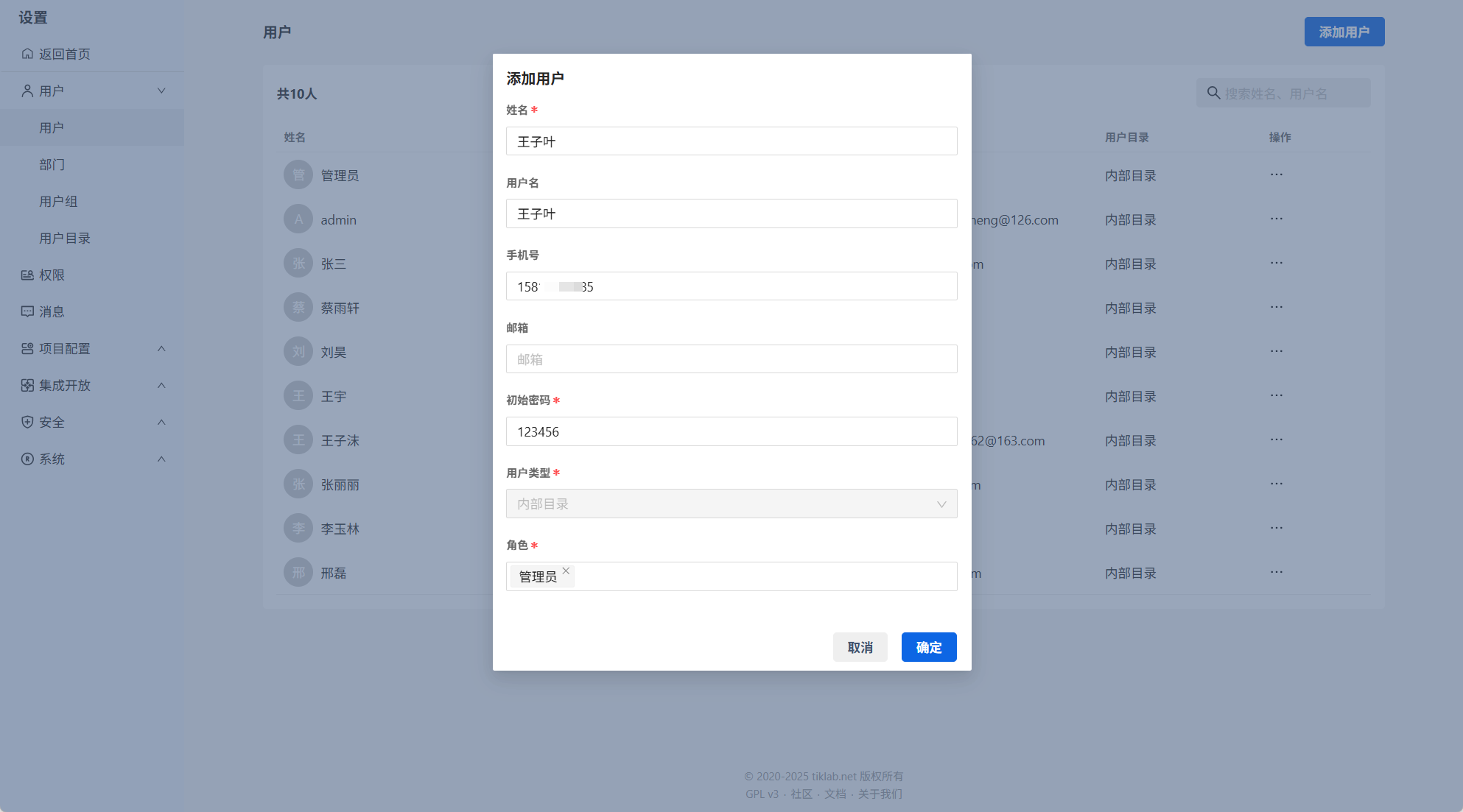 新建项目是会初始化成员与权限,之后管理员可以根据团队管理的要求加入新成员。在项目中添加成员之前需要再系统中添加用户