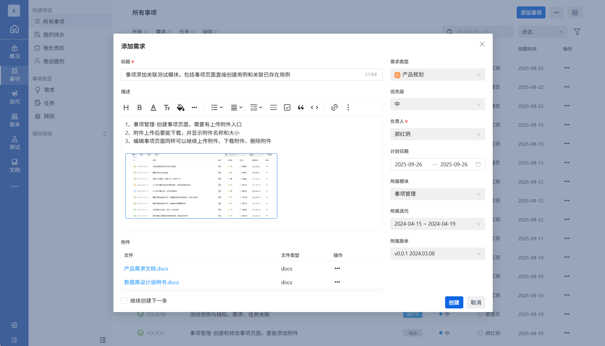所属迭代 | 否 | 选项为当前项目未完成的迭代,默认选择是开始日期最晚的未完成迭代; 若没有待选迭代,默认为空; 在迭代中的事项界面添加事项,默认是当前迭代; |