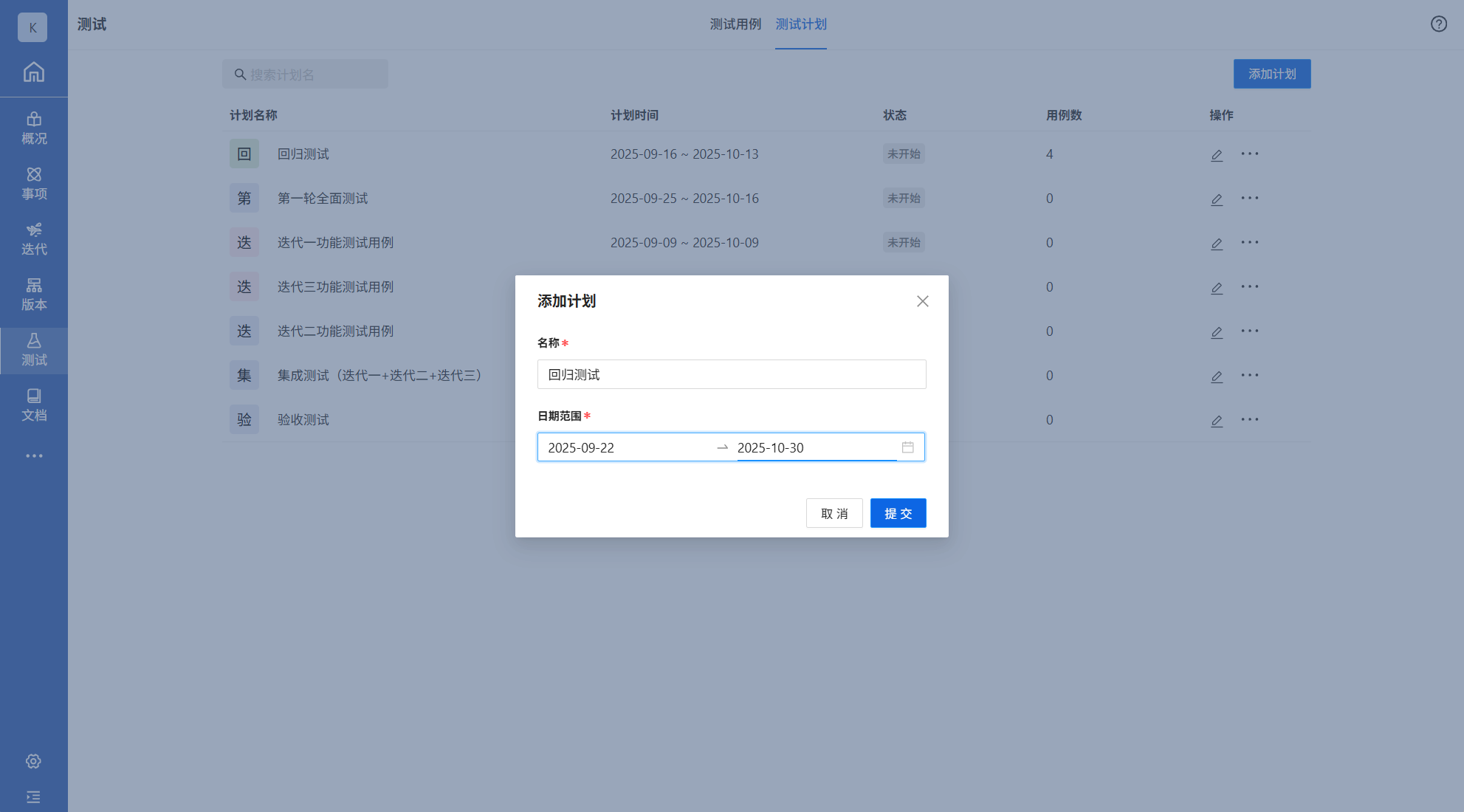 点击测试模块中的测试计划页面,添加测试计划,填写计划名称、测试计划时间等信息后点击提交,测试计划创建成功。