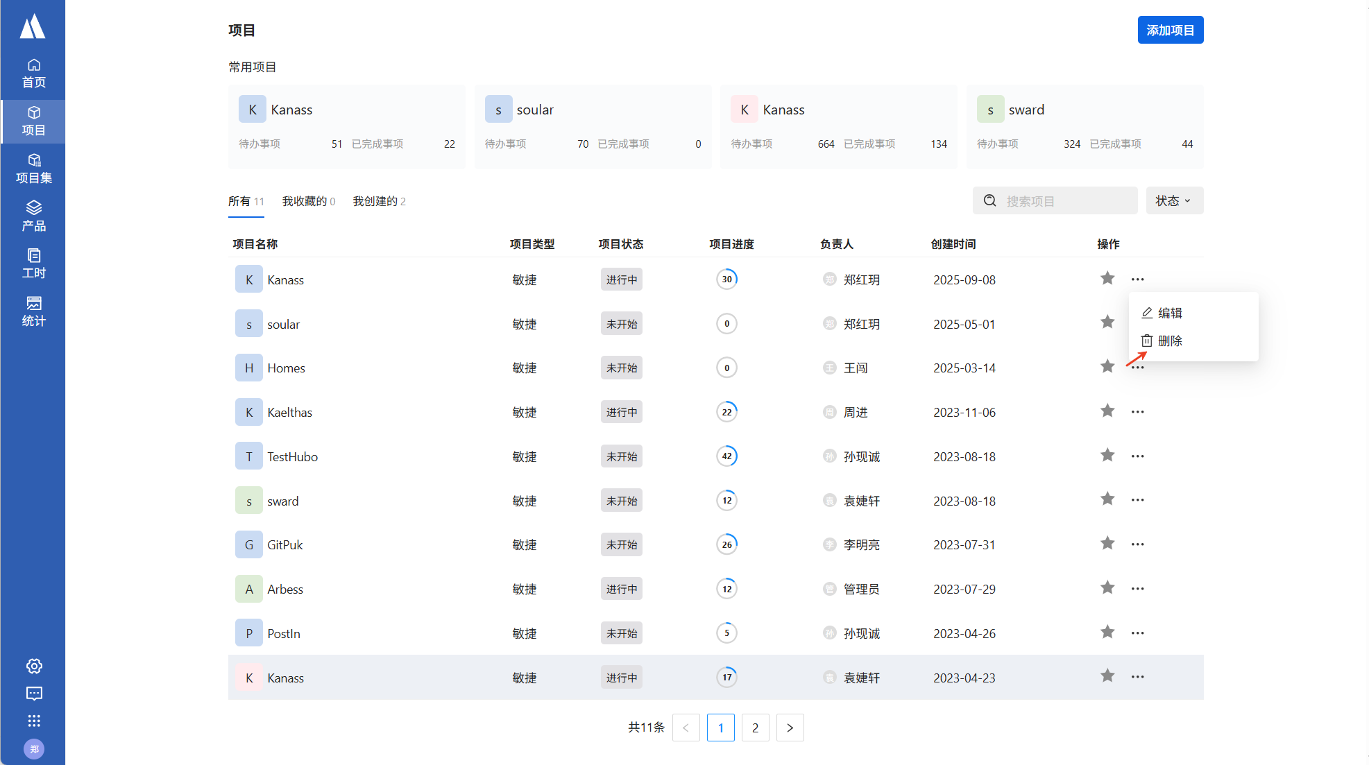 点击项目,在项目列表页面查询项目,可根据名字,状态等搜索
