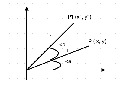 由 P (x,y) 逆时针旋转 b 度获得 P1(x1,y1); 由三角函数可以获得 P 点和 P1 点坐标之间的关系