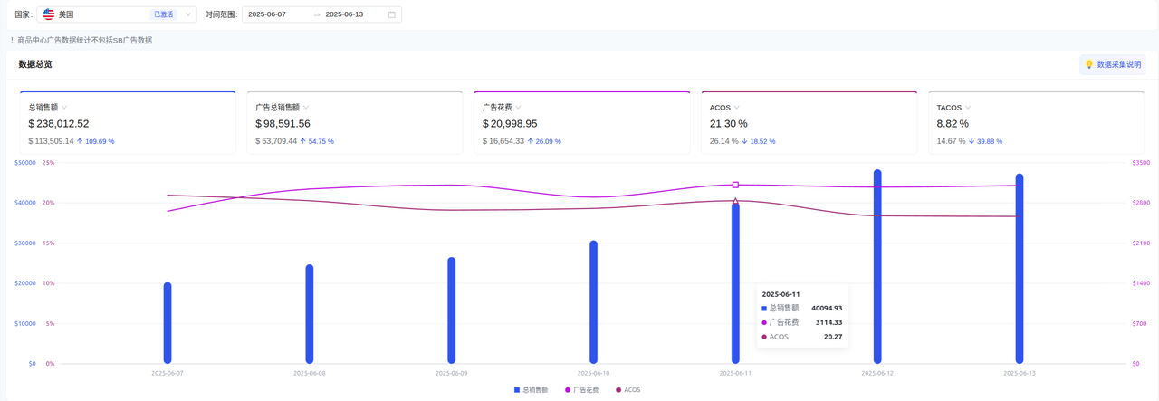 这个变化真的让我震惊。两个月前,我还在为32%的ACOS和入不敷出的情况发愁,现在ACOS降到了21%左右,而且销售额还大幅增长。算一下账,6月初这周的广告花费是两万一千美元,但广告销售额达到了九万八千多美元,虽然ACOS还是21%,但因为销售额大幅增长,整体利润空间反而扩大了。