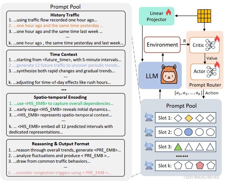(2)提示路由机制基于Actor-Critic强化学习框架,以时空编码器的输出作为输入,Actor网络为每个槽生成候选句子的概率分布并采样动作(选择句子),Critic网络计算期望奖励以指导Actor训练,最终将各槽所选句子拼接为适配当前实例的个性化提示,突破固定任务级提示模板的局限性。