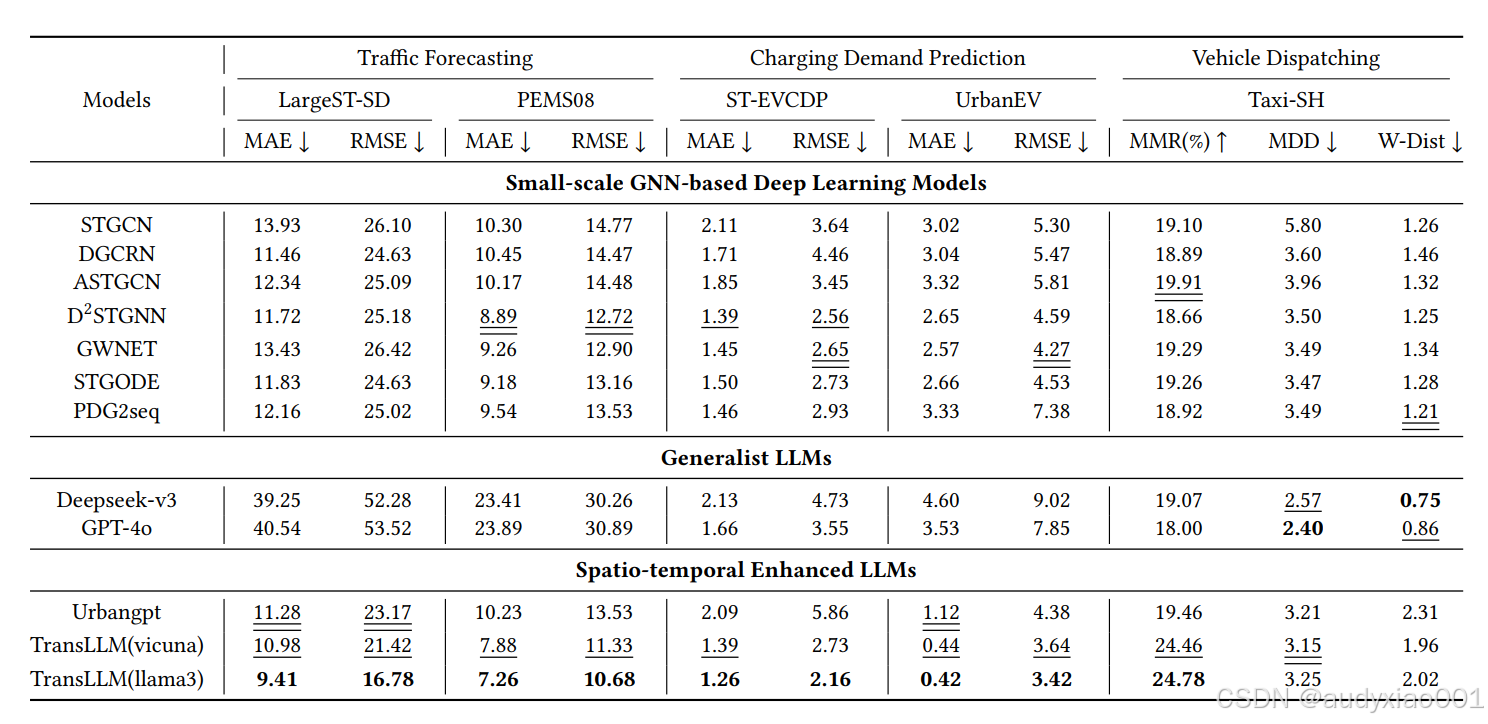 3、在车辆调度的Taxi-SH数据集上,TransLLM系列模型在MMR上表现突出,TransLLM(llama3)达24.78%,同时MDD和W-Dist指标也处于较优水平,整体展现出TransLLM在多交通任务中融合时空建模与大语言模型优势的良好性能。