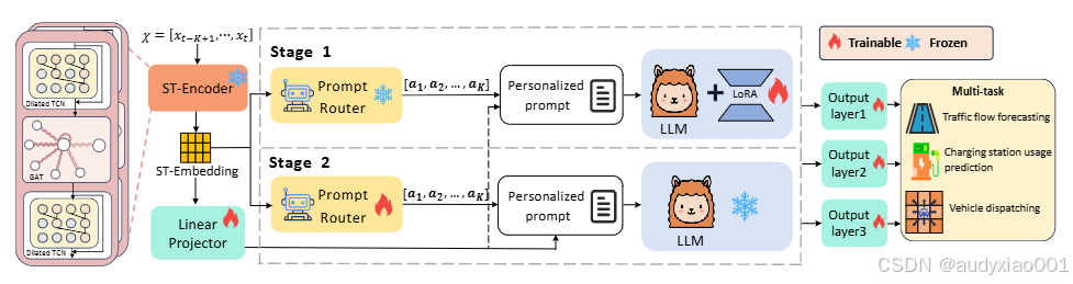 (1)多任务时空输入异质性:交通多任务场景涉及交通流量、出行需求、地理邻接等多种结构化输入,这类数据难以用自然语言有效表征,给统一建模带来挑战。