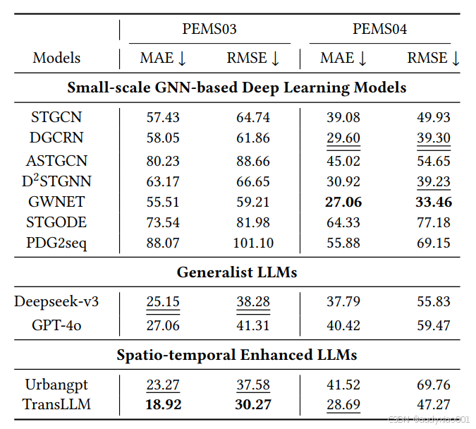 (2)通用大语言模型里,Deepseek-v3在PEMS03的MAE和RMSE均为第二优;