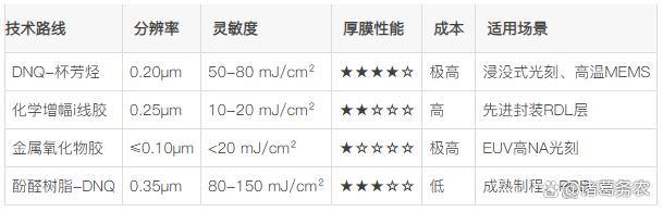 在成熟制程(0.35μm以上)、厚胶应用(MEMS/封装)领域,DNQ凭借成本与可靠性优势仍将主导市场。