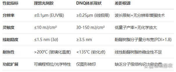 理想光刻胶需同时满足高分辨率、高灵敏度、低粗糙度(LER)、强耐刻蚀性等要求。DNQ体系在多项指标存在显著差距: