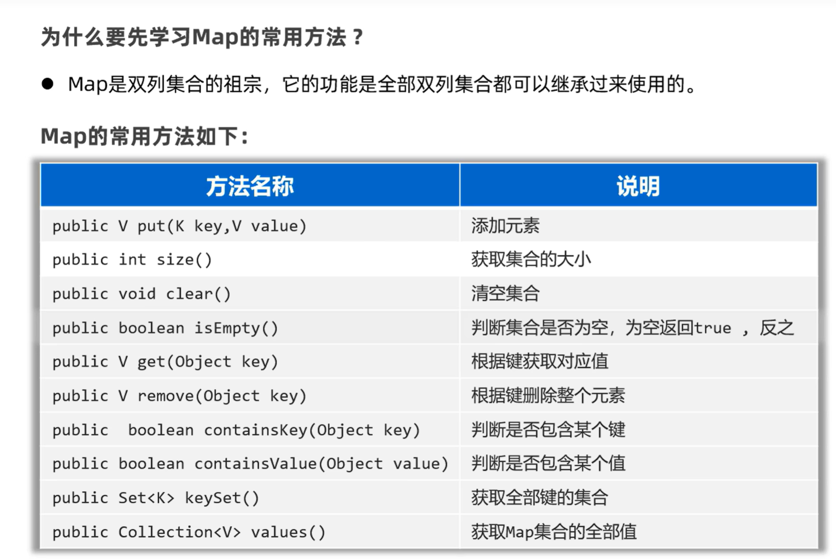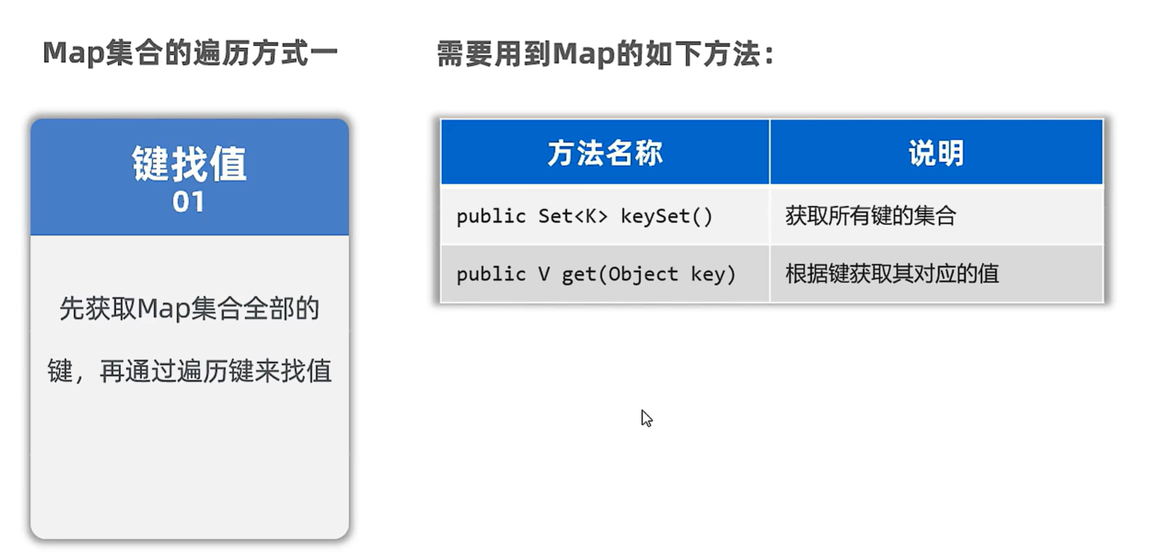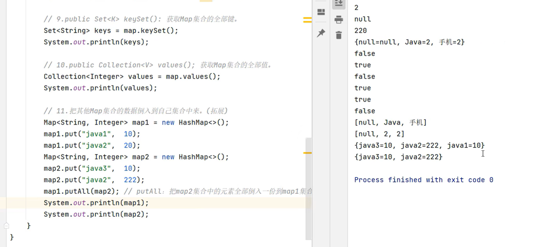 import java.util.Set;public class BIANLIMAP {public static void main(String[] args) {Map<String , Double> map = new HashMap<>();map.put("A", 1.0);map.put("B", 2.0);map.put("C", 3.0);map.put("D", 4.0);map.put("E", 5.0);System.out.println(map);//1.获取map全部的键Set<String> keys = map.keySet();System.out.println(keys);for (String key : keys) {double value = map.get(key);System.out.println(key + value);}}