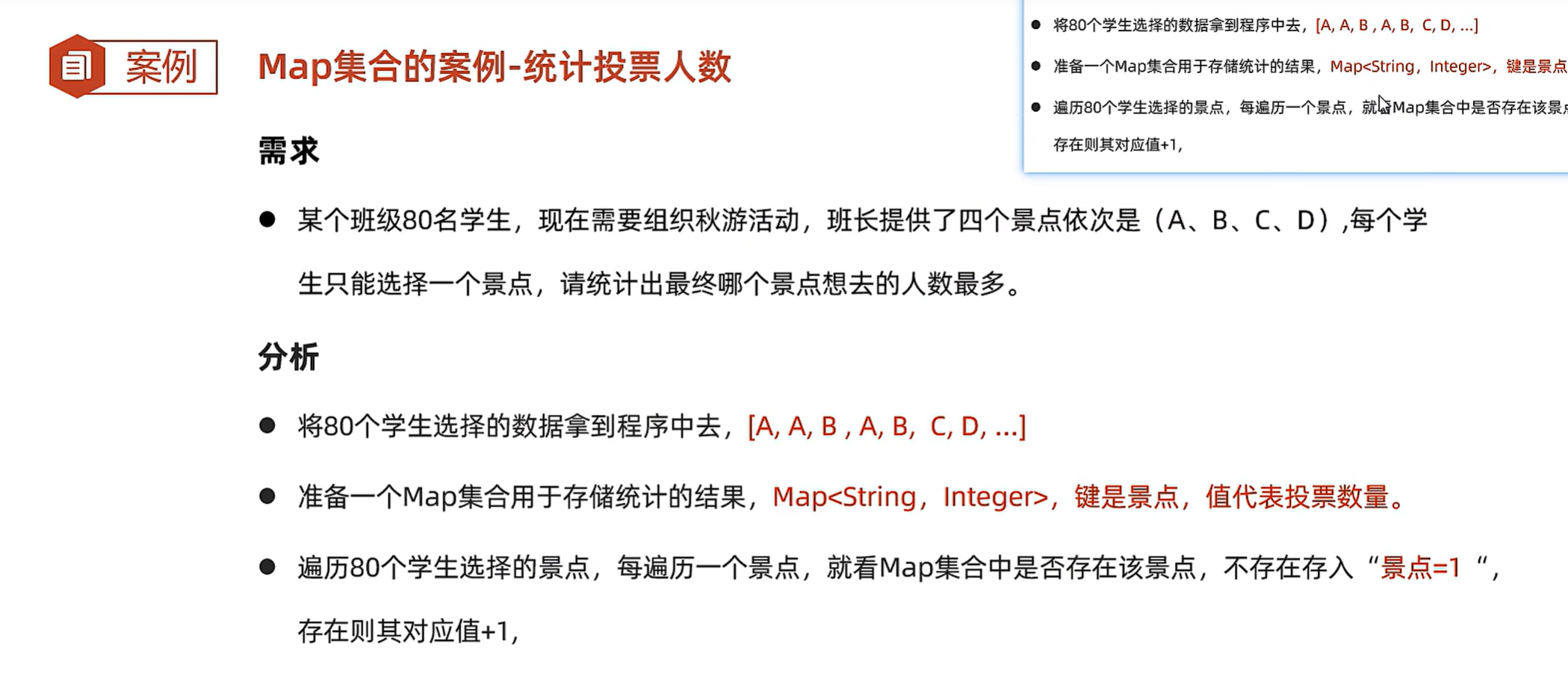 import java.util.*;public class lianxi {public static void main(String[] args) {List<String> data = new ArrayList<String>();String[] selects = {"A","B","C","D"};Random rand = new Random();for (int i = 0; i <=80; i++) {int index = rand.nextInt(4);//0 1 2 3data.add(selects[index]);}System.out.println(data);//统计每个景点的投票人数//准备一个map集合统计最终的结果Map<String,Integer> result = new HashMap<>();for (String s : data) {//问一下map集合是否存在该景点if(result.containsKey(s)){//说明统计过,其值+1,重新存入到mapresult.put(s,result.get(s) + 1);}else{result.put(s, 1);}}System.out.println(result);}