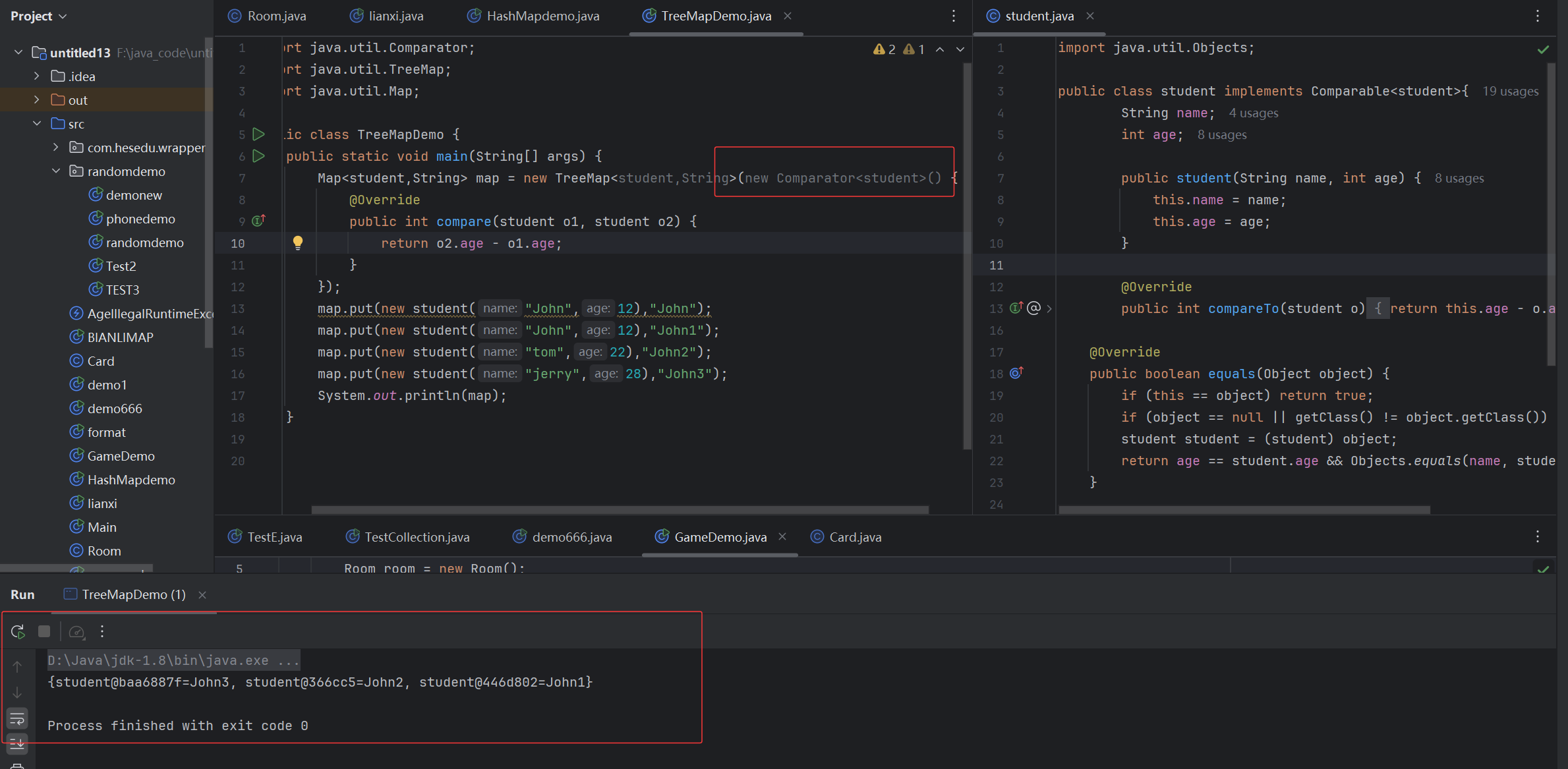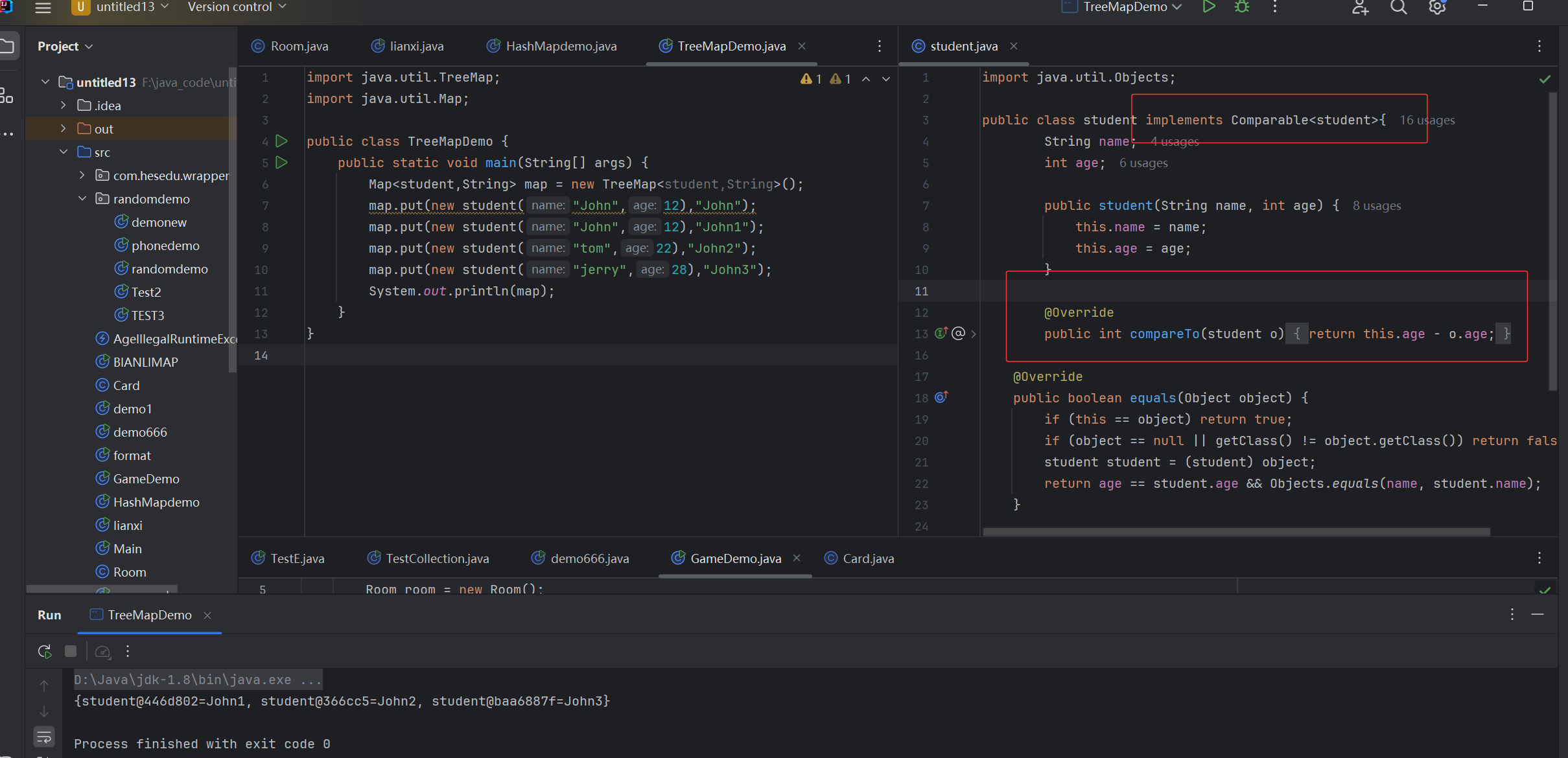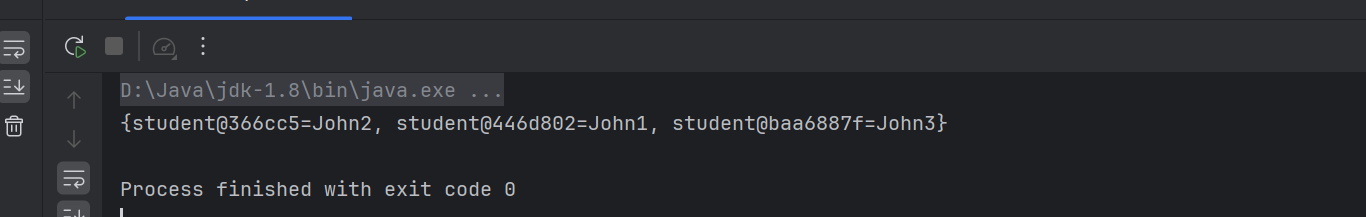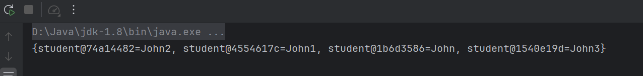 import java.util.Map;public class HashMapdemo {public static void main(String[] args) {Map<student,String> map = new HashMap<student,String>();map.put(new student("John",12),"John");map.put(new student("John",12),"John1");map.put(new student("tom",22),"John2");map.put(new student("jerry",28),"John3");System.out.println(map);}