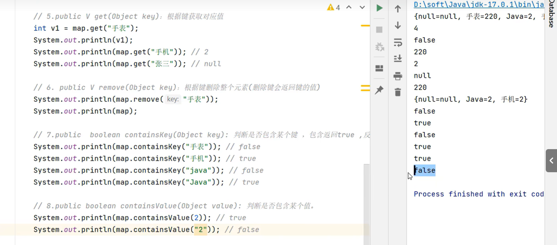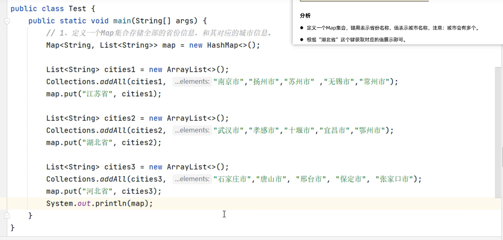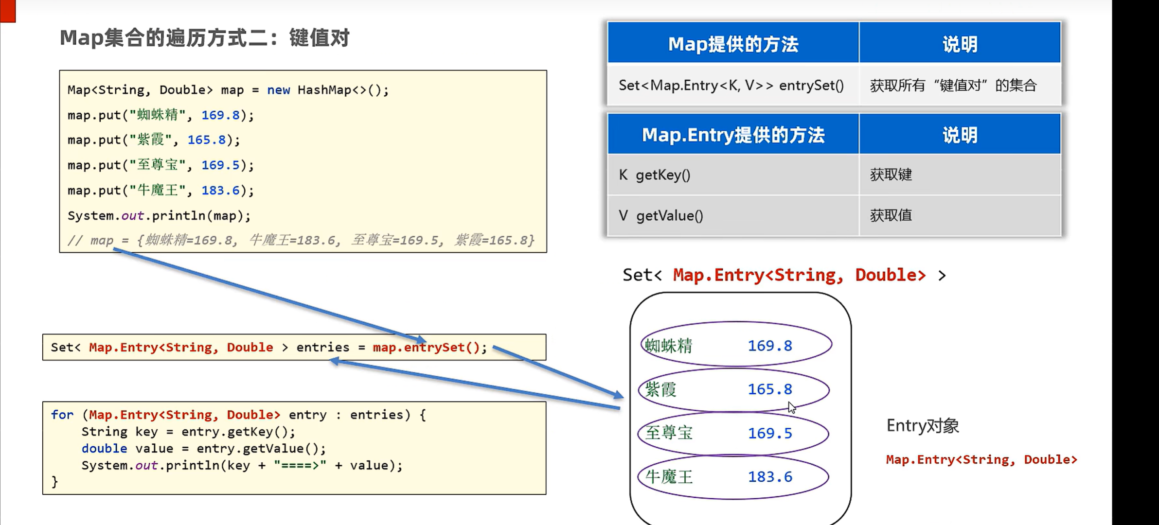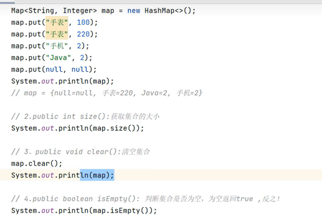 public class BIANLIMAP {public static void main(String[] args) {Map<String , Double> map = new HashMap<>();map.put("A", 1.0);map.put("B", 2.0);map.put("C", 3.0);map.put("D", 4.0); map.put("E", 5.0);System.out.println(map);Set<Map.Entry<String, Double>> entries = map.entrySet();for (Map.Entry<String, Double> entry : entries) {String key = entry.getKey();Double value = entry.getValue();System.out.println(key + ":" + value);}}