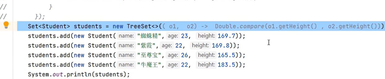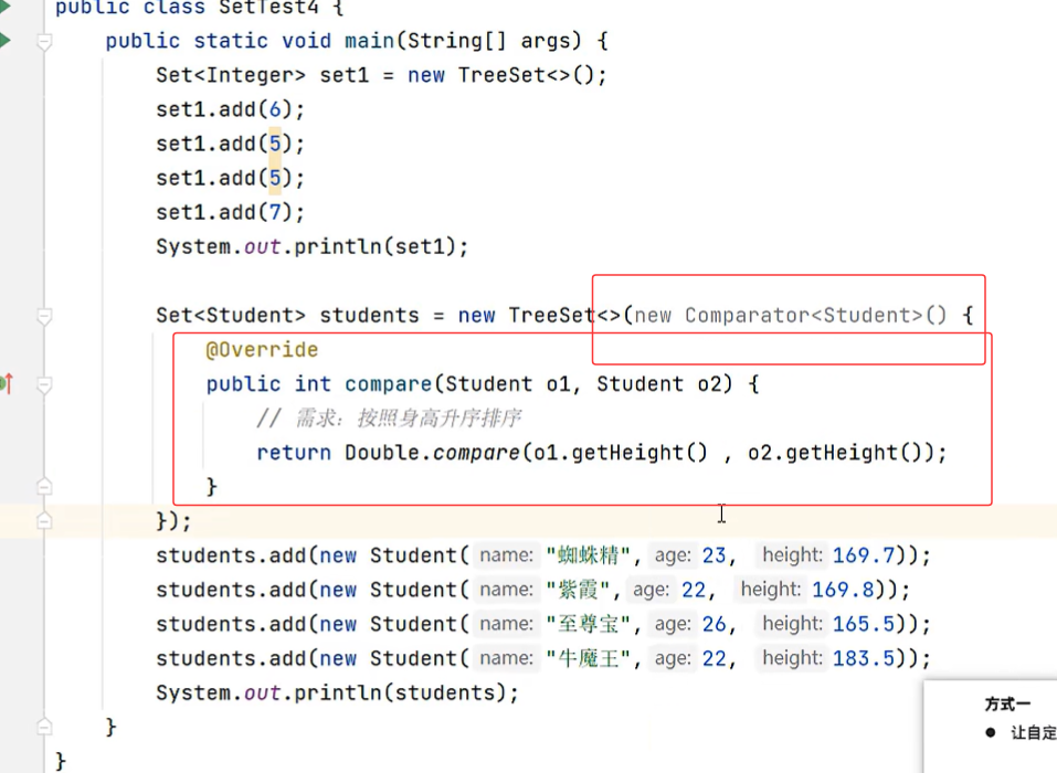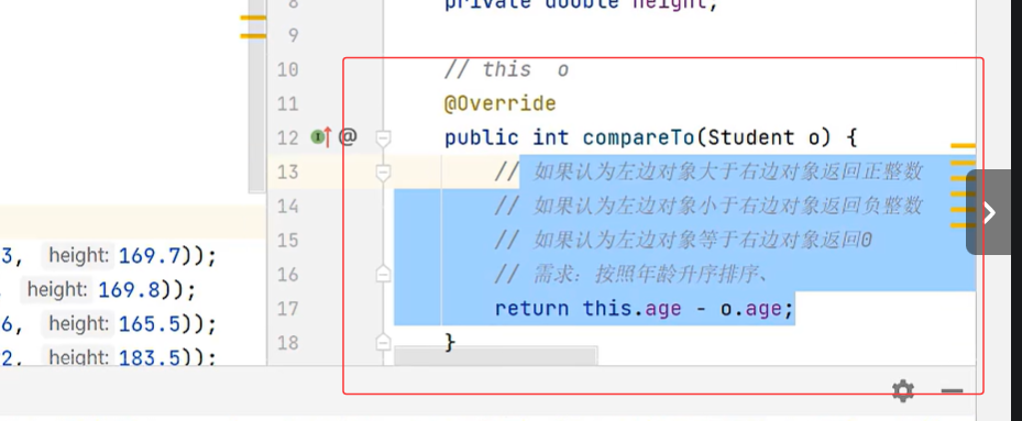 因为这个比较器对象离着这个集合更近,所以他会用比较器对象,所以是年龄的降序排序