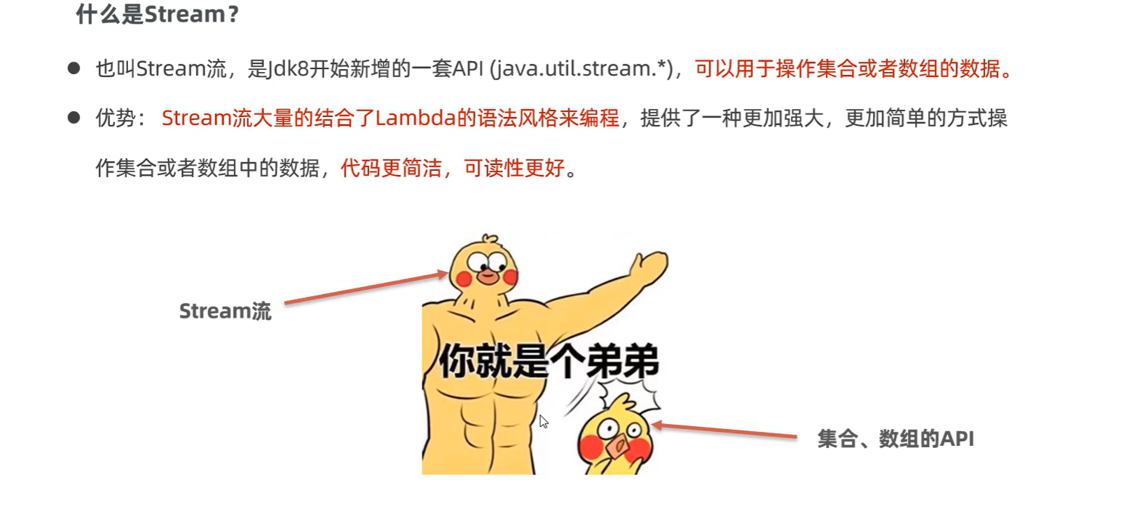 import java.util.stream.Stream;public class StreamTest {public static void main(String[] args) {List<student> students = new ArrayList<>();student s1 = new student("lili2",26,172.5);student s2 = new student("lili2",26,172.5);student s3 = new student("lili3",23,167.6);student s4 = new student("lili4",25,169.0);student s5 = new student("lili5",35,183.8);student s6 = new student("lili6",34,168.5);Collections.addAll(students, s1, s2, s3, s4, s5, s6);//需求找出年龄大于等于23 且年龄小于等于30的并降序排序students.stream().filter(s -> s.getAge() >= 23 && s.getAge() <= 30).sorted((o1,o2) -> o2.getAge() - o1.getAge()).forEach(s -> System.out.println(s));//需求 取出身高最高的3名学生 并输出students.stream().sorted((o1,o2) -> Double.compare(o2.getHeight(),o1.getHeight())).limit(3).forEach(s -> System.out.println(s));//需求 取出身高倒数的2名学生 并输出students.stream().sorted((o1,o2) -> Double.compare(o2.getHeight(),o1.getHeight())).skip(students.size() - 2).forEach(s -> System.out.println(s));//需求 找出身高超过168的学生叫什么,要求去除重复的名字 再输出,map其实就是加工students.stream().filter(s -> s.getHeight() > 168).map(s -> s.getName()).distinct().forEach(s -> System.out.println(s));//distinct 去重复自定义类型的对象(希望内容一样就认为重复 重写hashcode和equals)students.stream().filter(s -> s.getHeight() > 167).distinct().forEach(s -> System.out.println(s));Stream<String> st1 = Stream.of("111", "222");Stream<String> st2 = Stream.of("112", "223");Stream<String> concat = Stream.concat(st1, st2);concat.forEach(s -> System.out.println(s));}