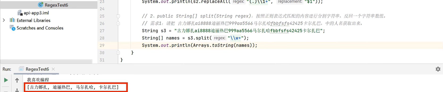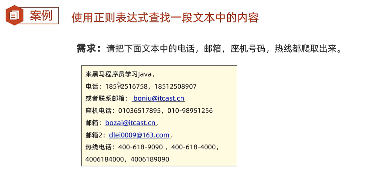 import java.util.regex.Pattern;public class demonew {public static void main(String[] args) {method1();}public static void method1() {String data = "电话 18827636726 18656455678" +"或者联系邮箱 dfhjkahds@qq.com" +"或者座机电话 010-98787898";//1.定义爬取规则String regex = "(\\w{2,}@\\w{2,20}(\\.\\w{2,10}){1,2}|(1[3-9]\\d{9}|0\\d{2,7}-?[1-9]\\d{4,19}))";//2.把正则表达式封装成一个pattern对象Pattern pattern = Pattern.compile(regex);//3.通过pattern对象去获取查找内容的匹配器对象Matcher matcher = pattern.matcher(data);//4.通过一个循环开始爬信息while (matcher.find()) {String rs = matcher.group();//获取到了找到的内容了System.out.println(rs);}}