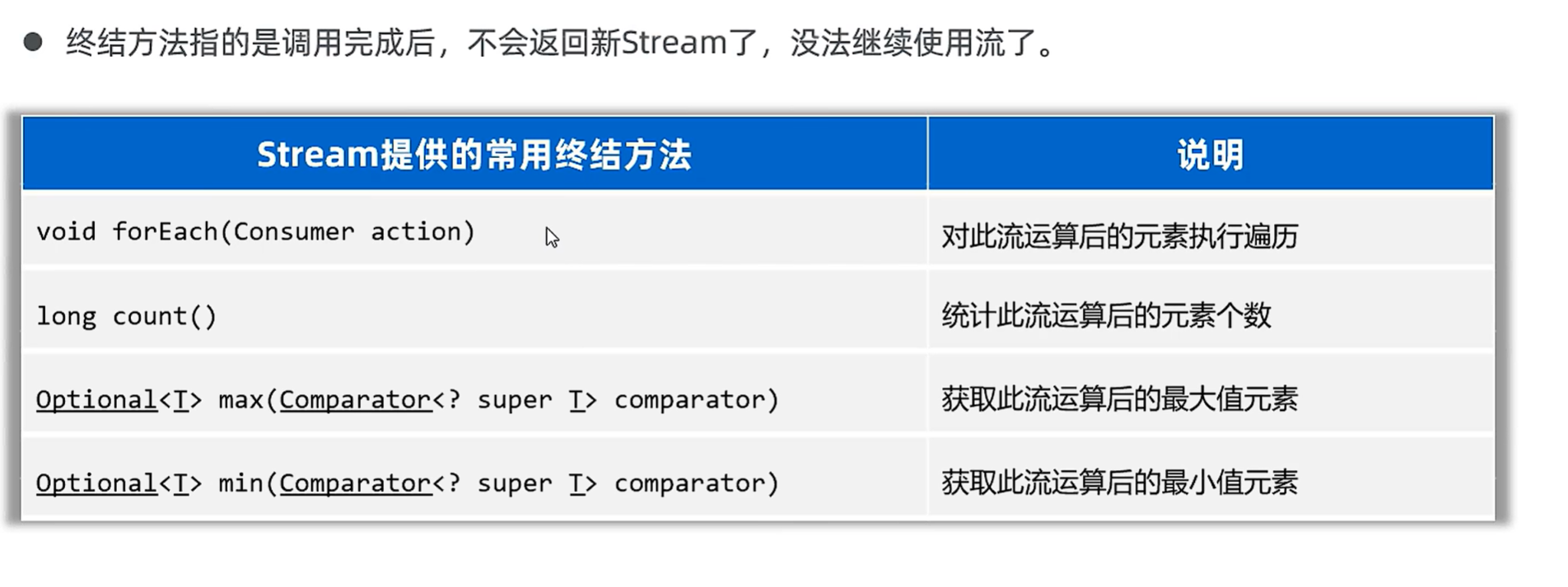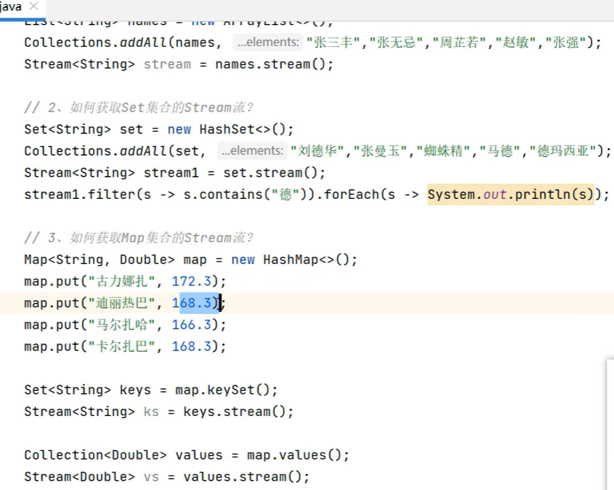 import java.util.stream.Stream;public class StreamTest {public static void main(String[] args) {List<student> students = new ArrayList<>();student s1 = new student("lili2", 26, 172.5);student s2 = new student("lili2", 26, 172.5);student s3 = new student("lili3", 23, 167.6);student s4 = new student("lili4", 25, 169.0);student s5 = new student("lili5", 35, 183.8);student s6 = new student("lili6", 34, 168.5);Collections.addAll(students, s1, s2, s3, s4, s5, s6);//需求 :计算超过168的学生有几人long count = students.stream().filter(s -> s.getHeight() > 168).count();System.out.println(count);//需求 :找出身高最高的学生对象,输出student student = students.stream().max((o1, o2) -> Double.compare(o1.getHeight(), o2.getHeight())).get();System.out.println(student);//需求: 找出身高高于170的学生对象,并放到一个新的集合中返回//流只能收集一次List<student> students1 = students.stream().filter(a -> a.getHeight() > 170).collect(Collectors.toList());System.out.println(students1);Set<student> students2 = students.stream().filter(a -> a.getHeight() > 170).collect(Collectors.toSet());//去重了System.out.println(students2);//需求: 找出身高高于170的学生对象,把学生对象的名字身高存入到一个map中Map<String, Double> students3 = students.stream().filter(s -> s.getHeight() > 170).distinct().collect(Collectors.toMap(a -> a.getName(), a -> a.getHeight()));System.out.println(students3);}