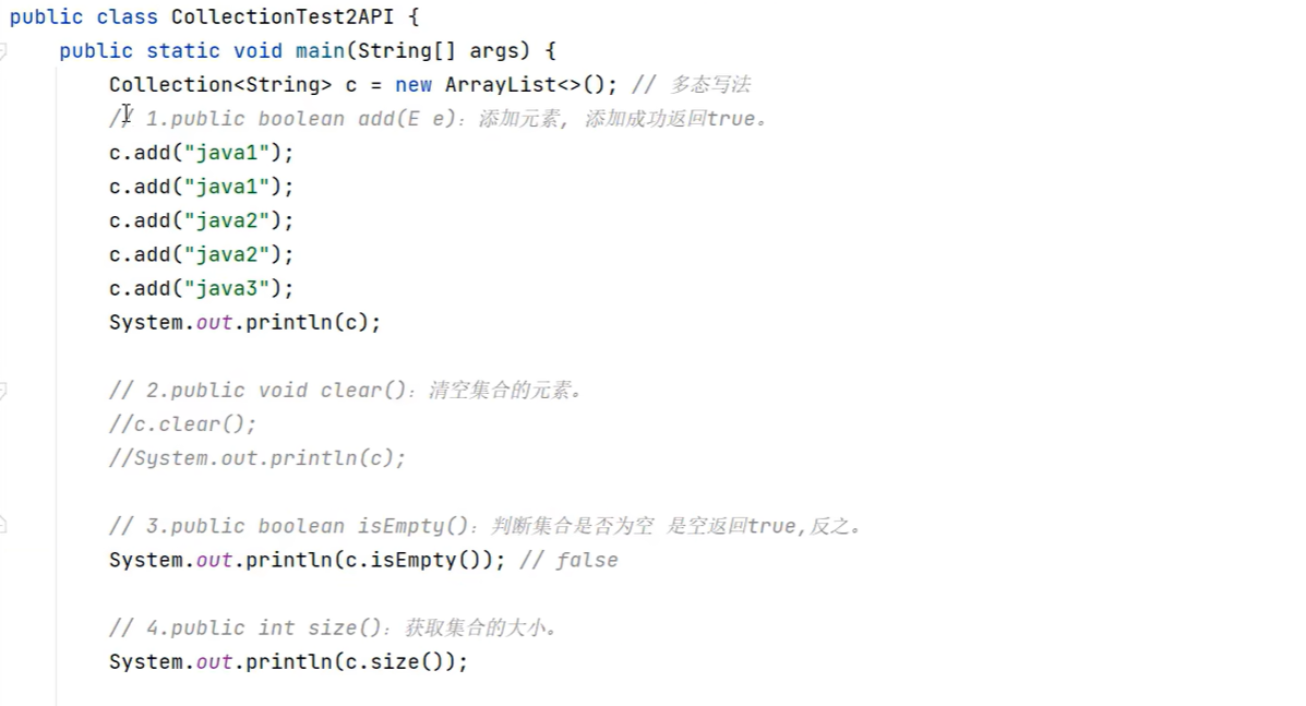 public class demo666 {public static void main(String[] args) {Collection<String> c = new ArrayList<>();c.add("a");c.add("b");c.add("c");c.add("d");