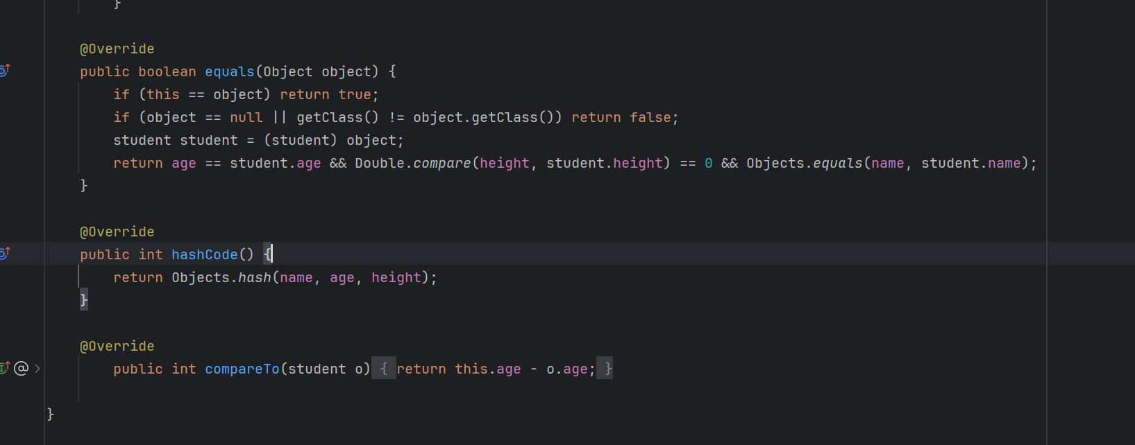 import java.util.Objects;public class student {String name;int age;public student(String name, int age) {this.name = name;this.age = age;}@Overridepublic boolean equals(Object object) {if (this == object) return true;if (object == null || getClass() != object.getClass()) return false;student student = (student) object;return age == student.age && Objects.equals(name, student.name);}@Overridepublic int hashCode() {return Objects.hash(name, age);}