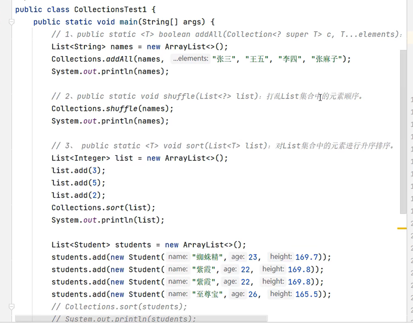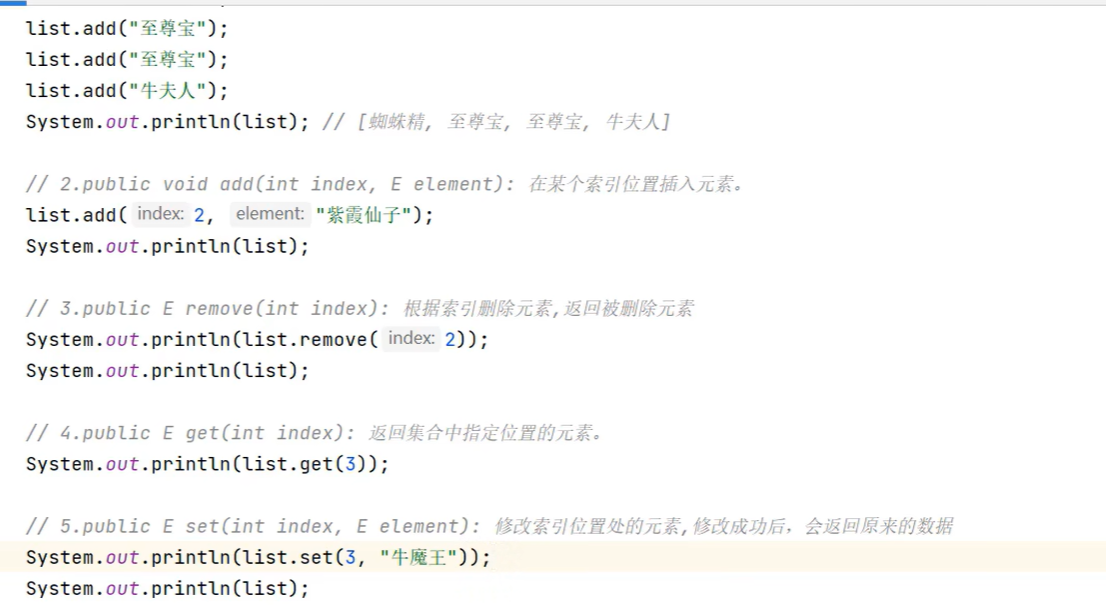 import java.util.List;public class TestCollection {public static void main(String[] args) {ArrayList<String> list = new ArrayList<>();//有序 可重复有索引list.add("java1");list.add("java2");list.add("java1");list.add("java2");System.out.println(list.get(1));System.out.println(list);HashSet<String> set = new HashSet<>();//无序 不重复无索引set.add("java1");set.add("java2");set.add("java1");set.add("java2");set.add("java3");System.out.println(set);}