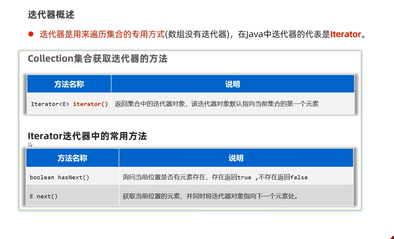 import java.util.Iterator;public class demo666 {public static void main(String[] args) {Collection<String> c = new ArrayList<>();c.add("a");c.add("b");c.add("c");c.add("d");//1.使用迭代器遍历集合//从集合对象中获取迭代器对象Iterator<String> it = c.iterator();while(it.hasNext()){//这个hashnet方法是调用迭代器String demo = it.next();System.out.println(demo);}}