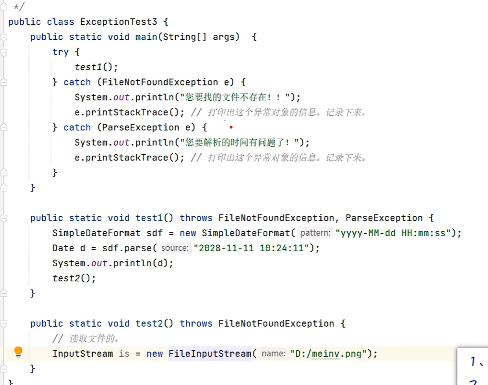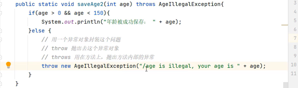 import com.sun.corba.se.impl.resolver.SplitLocalResolverImpl;public class TestE {public static void main(String[] args) {try {saveAge(160);} catch (Exception e) {e.printStackTrace();System.out.println("底层出现了问题");}}public static void saveAge(int age){if(age > 0 && age < 150){System.out.println("年龄保存成功" + age);}else{throw new AgeIllegalRuntimeException("年龄非法,你的年龄是" + age);}}
