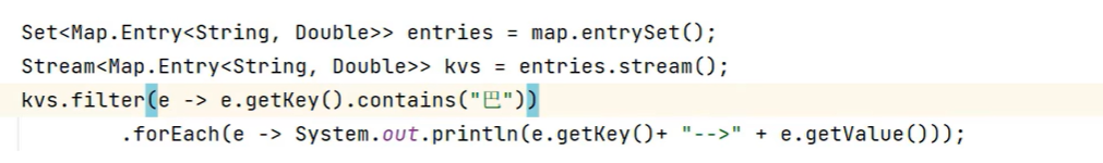 import java.util.Set;public class BIANLIMAP {public static void main(String[] args) {Map<String , Double> map = new HashMap<>();map.put("A", 1.0);map.put("B", 2.0);map.put("C", 3.0);map.put("D", 4.0);map.put("E", 5.0);System.out.println(map);map.forEach((k,v) ->{System.out.println(k + "====>" + v);});}