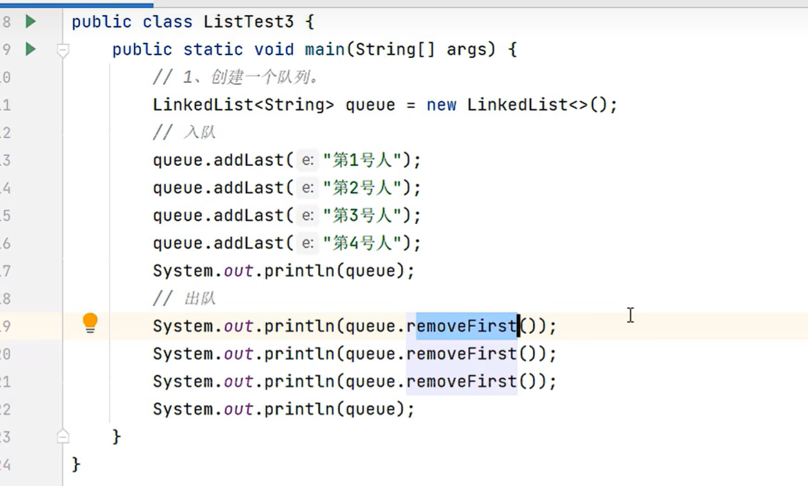 import java.util.function.Consumer;public class demo666 {public static void main(String[] args) {List<String> list = new ArrayList<>();list.add("小李子1");list.add("小李子2");list.add("小李子3");list.add("小李子4");list.add("小子1");System.out.println(list);Iterator<String> it = list.iterator();while (it.hasNext()) {String name = it.next();if (name.contains("李")) {it.remove();//这个操作删除迭代器当前遍历的数据,每删除一个相当于底层做了一个i--}}System.out.println(list);}