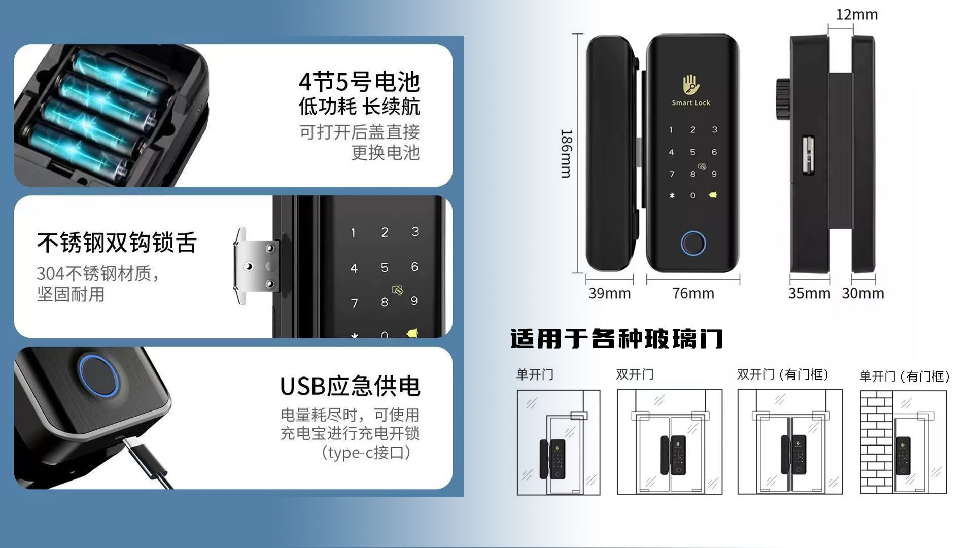 同时,玻璃智能门锁产品采用的门夹式安装方法,不需要对玻璃门进行打孔,按教程自己就可以完成安装。整个硬件安装+软件配置的时间不超过1小时。