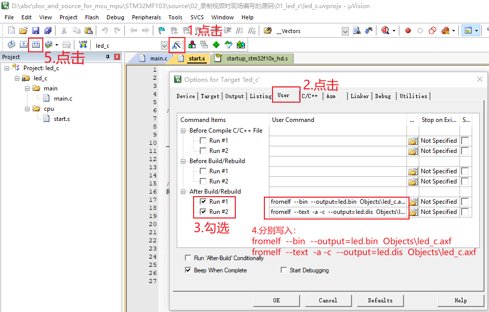然后重新编译,即可得到二进制文件led.bin(以后会分析)、反汇编文件led.dis。 如下图操作:
