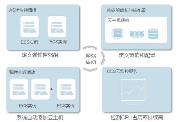 弹性伸缩(Auto Scaling,以下简称AS)是根据用户的业务需求,通过设置伸缩规则来自动增加/缩减业务资源。AS支持自动调整弹性云服务器和带宽资源。