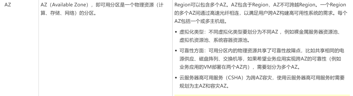- 可用区(AZ,Availability Zone):一个AZ是一个或多个物理数据中心的集合,有独立的风火水电,AZ内逻辑上再将计算、网络、存储等资源划分成多个集群。一个Region中的多个AZ间通过高速光纤相连,以满足用户跨AZ构建高可用性系统的需求。