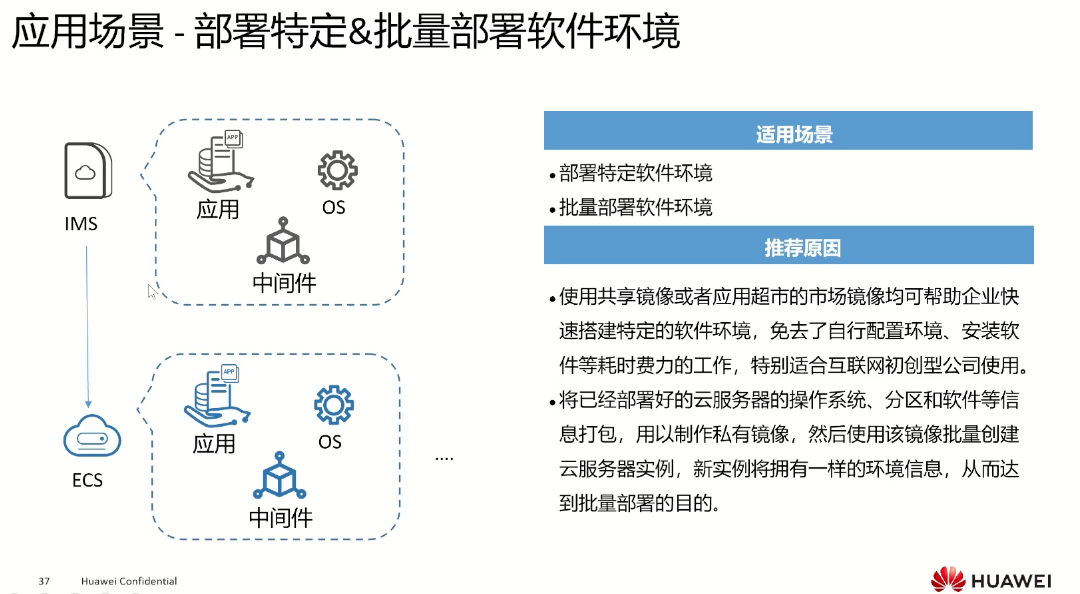 将已经部署好的弹性云服务器的操作系统、分区和软件等信息打包,用以制作私有镜像,然后使用该镜像批量创建弹性云服务器实例,新实例将拥有一样的环境信息,从而达到批量部署的目的。