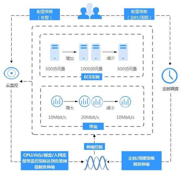 通过伸缩控制可以实现弹性云服务器(ECS)实例伸缩和带宽伸缩: