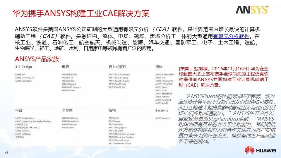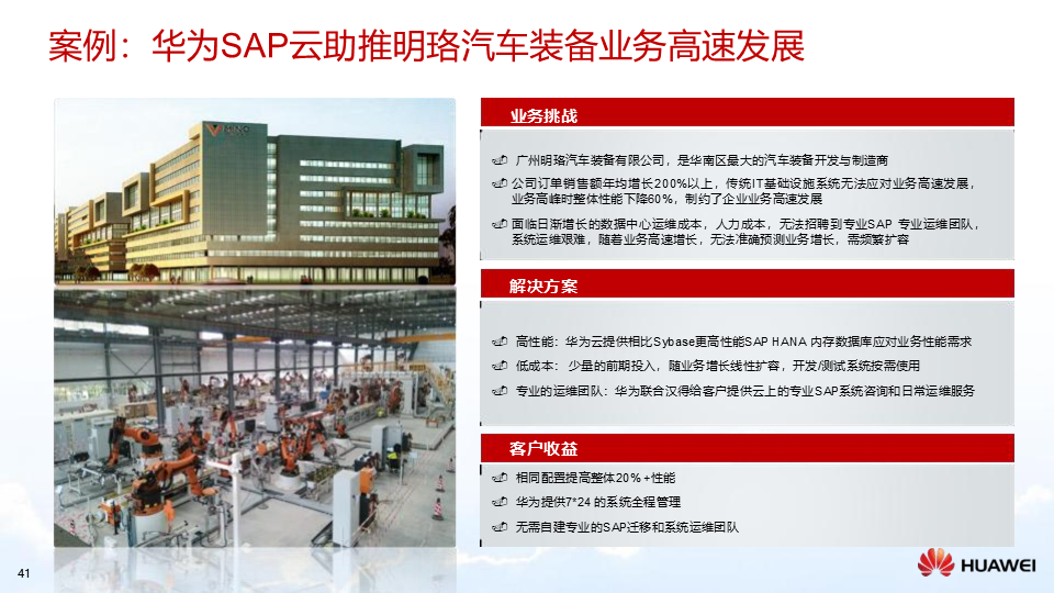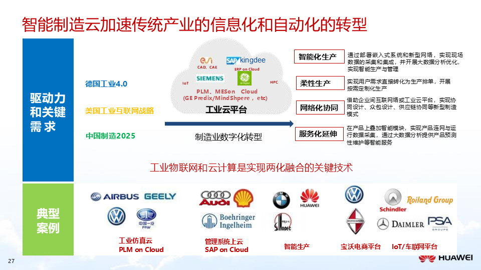 适应人群为制造企业中高层决策者(数字化转型战略岗)、生产运营团队(智能生产 / 设备管理岗)、研发设计人员(工业仿真 / 数字化设计岗)、IT 与 OT 融合团队(工业互联网平台搭建岗)及智能制造解决方案服务商(生态合作 / 项目实施岗),尤其适用于汽车、石化、工程机械等需推进工业互联网与智能制造的行业企业。主要内容围绕华为制造行业数字化转型解决方案展开,核心含 “1 个核心架构 + 6 大解决方案 + 实战案例 + 生态合作”:“1 个核心架构” 以工业互联网为基础,融合 IoT、云计算、大数据、AI 技术,遵循 “数字化 - 集成化 - 模型化 - 可视化 - 自动化” 五化原则及 “三要三不要” 实施原则;“6 大解决方案” 包括移动互联云(支撑电商与移动办公)、HPC 高性能计算(适配 CAE 仿真 / 石油勘探)、IoT 平台与边缘计算(设备连接与实时数据处理)、工业设计仿真云(CAD/CAE/PLM 云化)、ERP 企业管理云(SAP on Cloud 降本提效)、混合云(兼顾传统与创新应用);“实战案例” 含华为松山湖智能工厂(全流程数字化运营)、中国石化智能生产、中联重科农机远程运维等;“生态合作” 联合达索、ANSYS、PTC 等伙伴,提供全栈式服务,为企业提供从技术架构到落地实施的全流程指引,助力实现智能化生产、柔性制造与服务化转型。