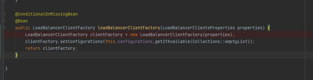 构建工厂类,根据配置项构建,断点打上看看配置项有没有对应的关键词:LoadBalancerClientConfiguration