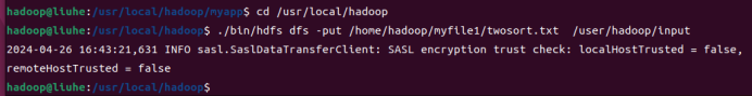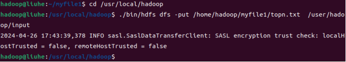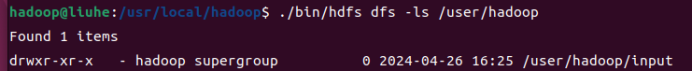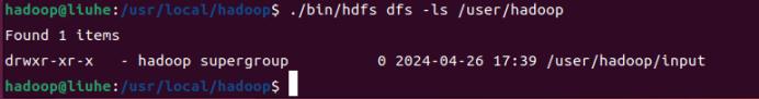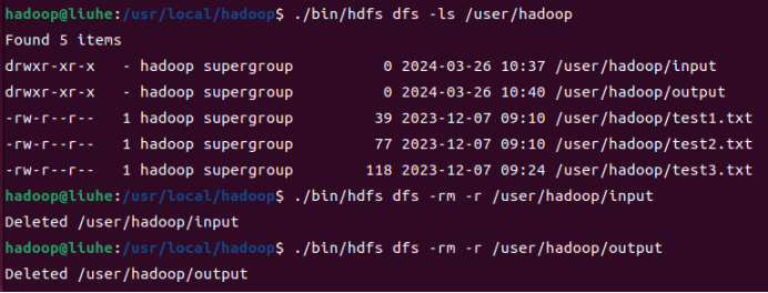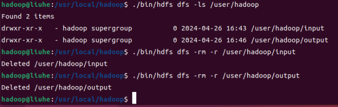 2.查看自己/user/hadoop/目录下有没有input、output文件夹,有的话删除。
