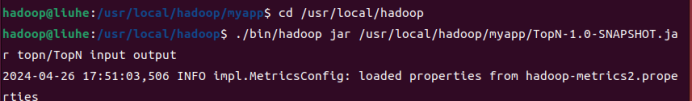 public class TopN {public static class TopNMapper extends Mapper<Object, Text, IntWritable, Text> {private TreeMap<Integer, String> topNMap = new TreeMap<>();public void map(Object key, Text value, Context context) throws IOException, InterruptedException {String[] tokens = value.toString().split(",");String word = tokens[0];int count = Integer.parseInt(tokens[1]);topNMap.put(count, word);}public void cleanup(Context context) throws IOException, InterruptedException {for (Integer key : topNMap.descendingKeySet()) {context.write(new IntWritable(key), new Text(topNMap.get(key)));}}}public static class TopNReducer extends Reducer<IntWritable, Text, IntWritable, Text> {private TreeMap<Integer, String> topNMap = new TreeMap<>();public void reduce(IntWritable key, Iterable<Text> values, Context context) throws IOException, InterruptedException {String word = "";int count = key.get();for (Text value : values) {word = value.toString();}topNMap.put(count, word);if (topNMap.size() > 5) {topNMap.remove(topNMap.firstKey());}}public void cleanup(Context context) throws IOException, InterruptedException {for (Integer key : topNMap.descendingKeySet()) {context.write(new IntWritable(key), new Text(topNMap.get(key)));}}}public static void main(String[] args) throws Exception {Configuration conf = new Configuration();Job job = Job.getInstance(conf, "TopN");job.setJarByClass(TopN.class);job.setMapperClass(TopNMapper.class);job.setReducerClass(TopNReducer.class);job.setMapOutputKeyClass(IntWritable.class);job.setMapOutputValueClass(Text.class);job.setOutputKeyClass(IntWritable.class);job.setOutputValueClass(Text.class);FileInputFormat.addInputPath(job, new Path("input/topn.txt"));FileOutputFormat.setOutputPath(job, new Path("output"));System.exit(job.waitForCompletion(true) ? 0 : 1);}