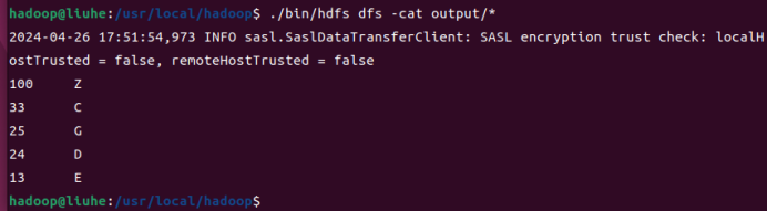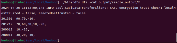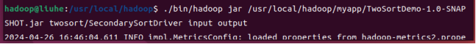 public class SecondarySortDriver extends Configured implements Tool {private static final String INPATH = "input/twosort.txt";// 输入文件路径private static final String OUTPATH = "output/sample_output";// 输出文件路径private static Logger theLogger = Logger.getLogger(SecondarySortDriver.class);@SuppressWarnings("deprecation")@Overridepublic int run(String[] args) throws Exception {Configuration conf = getConf();Job job = new Job(conf);job.setJarByClass(SecondarySortDriver.class);job.setJobName("SecondarySortDriver");FileInputFormat.setInputPaths(job, new Path(args[0]));FileOutputFormat.setOutputPath(job, new Path(args[1]));job.setOutputKeyClass(DateTemperaturePair.class);job.setOutputValueClass(Text.class);job.setMapperClass(SecondarySortMapper.class);job.setReducerClass(SecondarySortReducer.class);job.setPartitionerClass(DateTemperaturePartitioner.class);job.setGroupingComparatorClass(DateTemperatureGroupingComparator.class);FileOutputFormat.setOutputPath(job, new Path(args[1]));// 为map-reduce任务设置OutputFormat实现类// 设置输出路径FileSystem fs = FileSystem.get(conf);Path outPath = new Path(OUTPATH);if (fs.exists(outPath)) {fs.delete(outPath, true);}boolean status = job.waitForCompletion(true);theLogger.info("run(): status=" + status);return status ? 0 : 1;}public static void main(String[] args) throws Exception {args = new String[2];args[0] = INPATH;args[1] = OUTPATH;// Make sure there are exactly 2 parametersif (args.length != 2) {theLogger.warn("SecondarySortDriver <input-dir> <output-dir>");throw new IllegalArgumentException("SecondarySortDriver <input-dir> <output-dir>");}int returnStatus = submitJob(args);theLogger.info("returnStatus=" + returnStatus);System.exit(returnStatus);}public static int submitJob(String[] args) throws Exception {int returnStatus = ToolRunner.run(new SecondarySortDriver(), args);return returnStatus;}