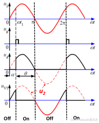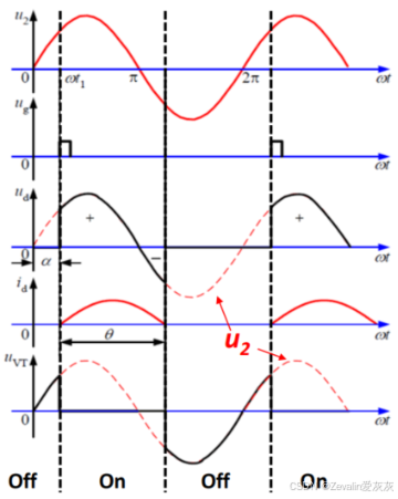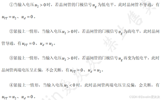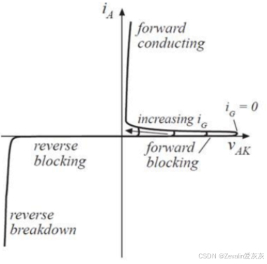 ②当晶闸管导通时,如果门极电压置零,晶闸管依旧是导通的,也就是说,它是一个无法主动关断的器件,只有待晶闸管两端电压呈反偏时,晶闸管才能够关断。