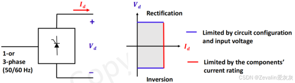 (2)下左图所示的是一个简单的晶闸管转换器电路示意图,其工作区间如下右图所示,其中上下限电压受电路结构和输入电压限制,最大导通电流受组件电流额定值限制。