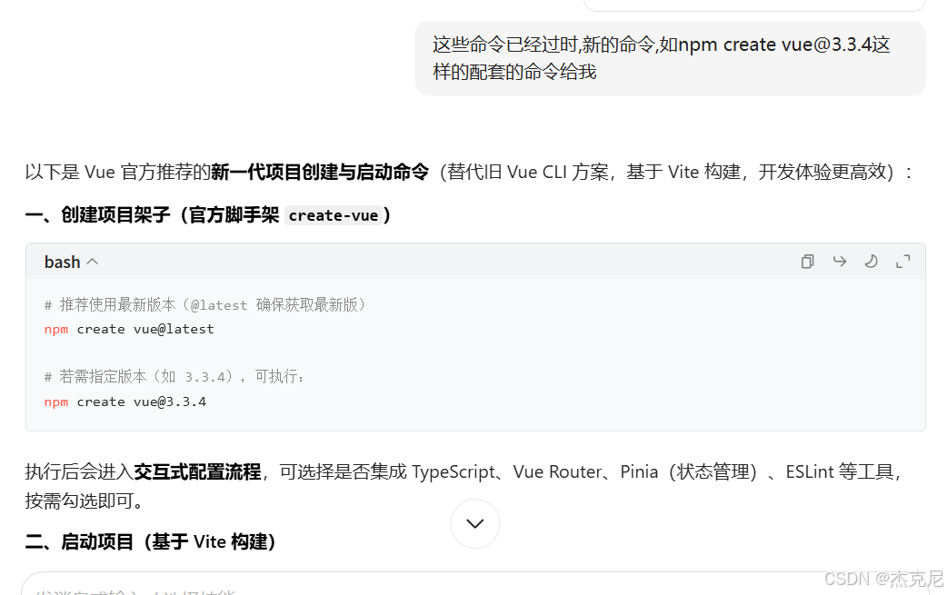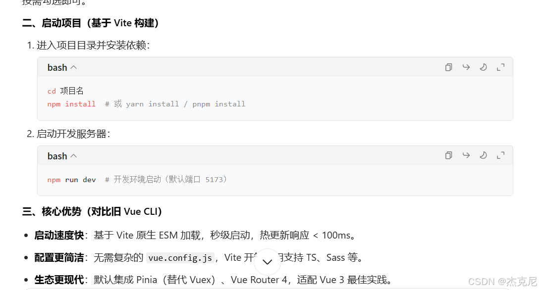 Vite:新一代构建工具,基于原生 ES 模块,启动速度极快(秒级),是 Vue 3 推荐的脚手架。安装与创建项目: