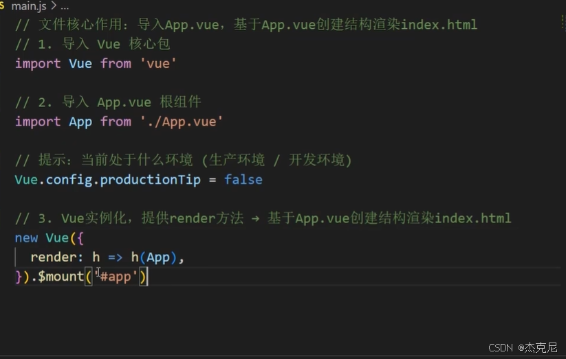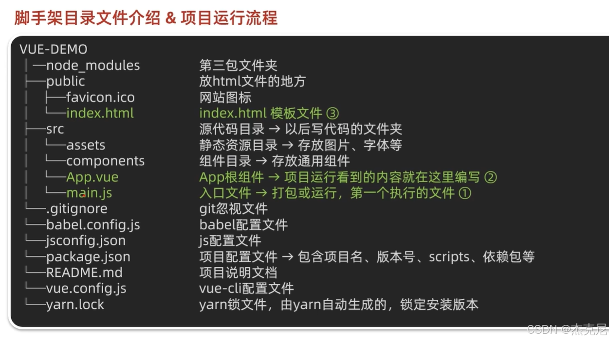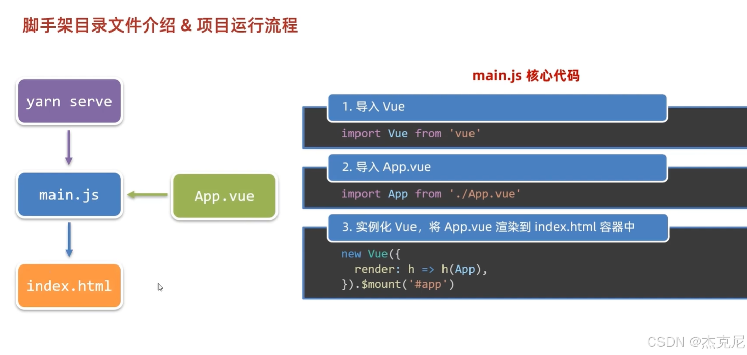 运行流程:main.js 导入 App.vue 并挂载到 index.html 的 #app 节点,App.vue 中通过路由或组件嵌套渲染整个应用。