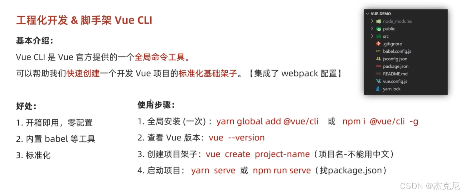 Vue CLI:Vue 官方早期推出的脚手架,基于 Webpack 构建,功能完善但启动速度较慢。安装与创建项目: