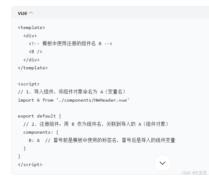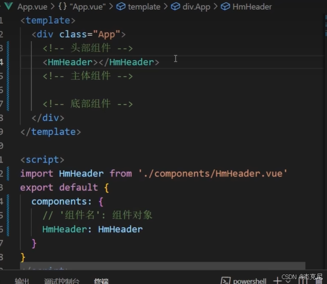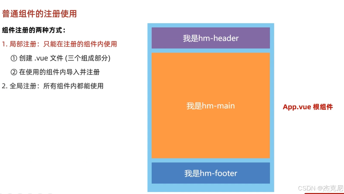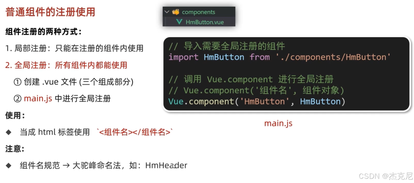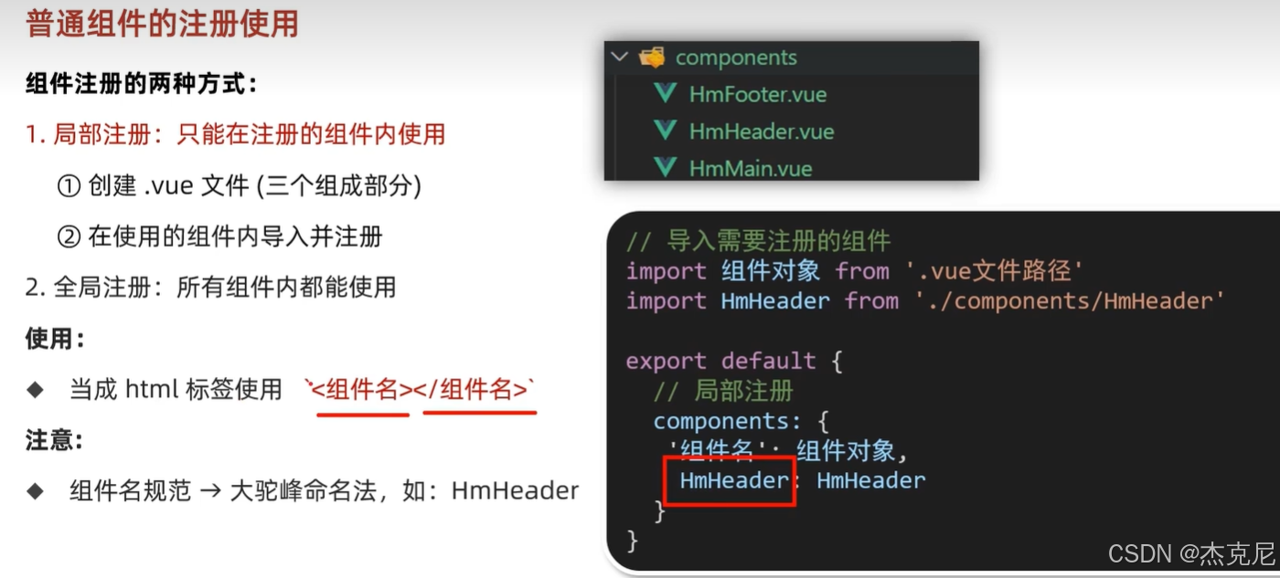局部注册:在需要使用组件的文件中,通过 import 引入,再在 components 选项中注册。如上文的 HmHeader 就是局部注册,仅在 App.vue 中可用。