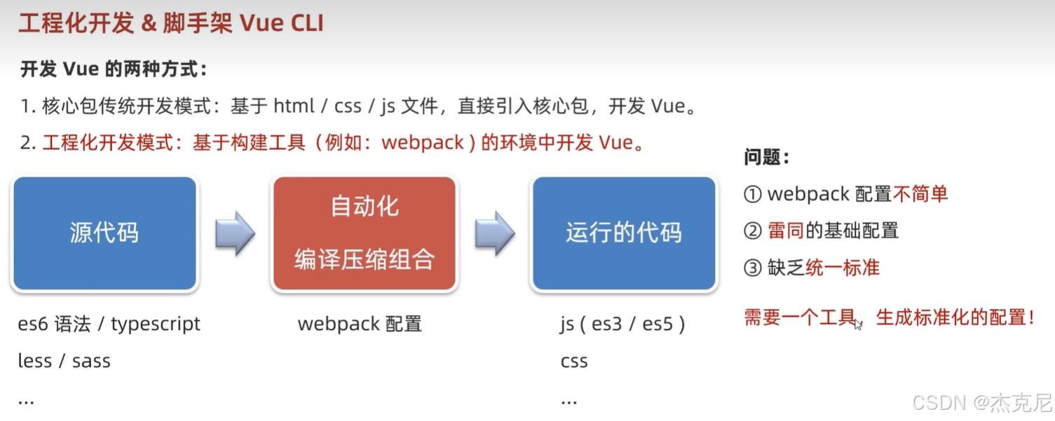 Vue 工程化开发依赖脚手架工具,它能帮我们快速搭建项目结构、集成打包工具、规范化开发流程,是企业级项目的必备能力。