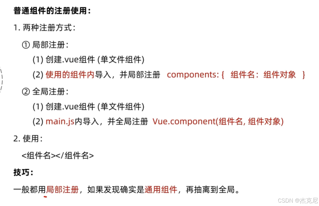 组件注册分为局部注册(仅当前组件可用)和全局注册(所有组件可用)。